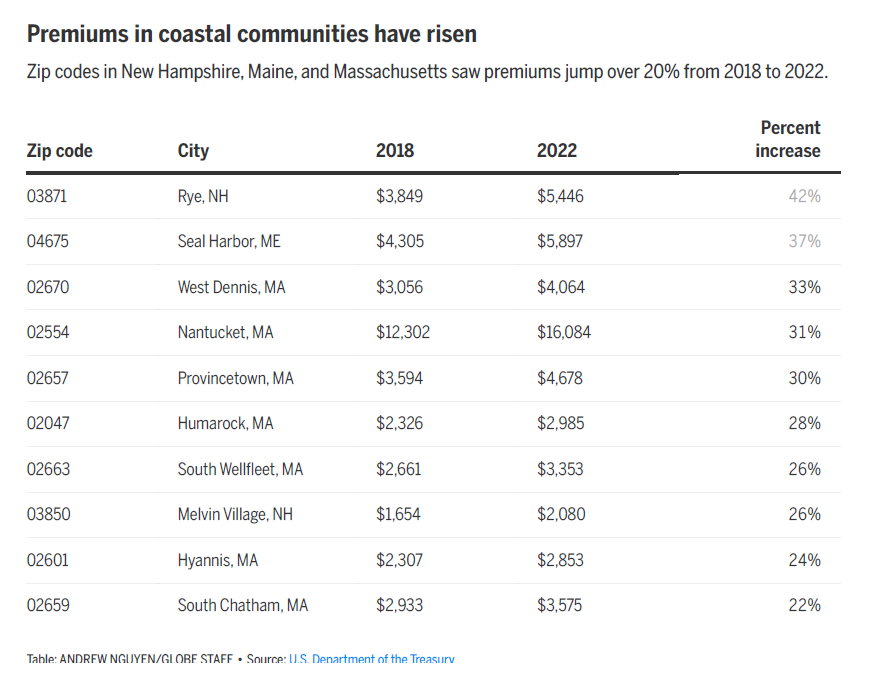 “Rising premiums are the market’s response to what science has told us for decades,” said Ali Hiple, a senior policy analyst at the Conservation Law Foundation.